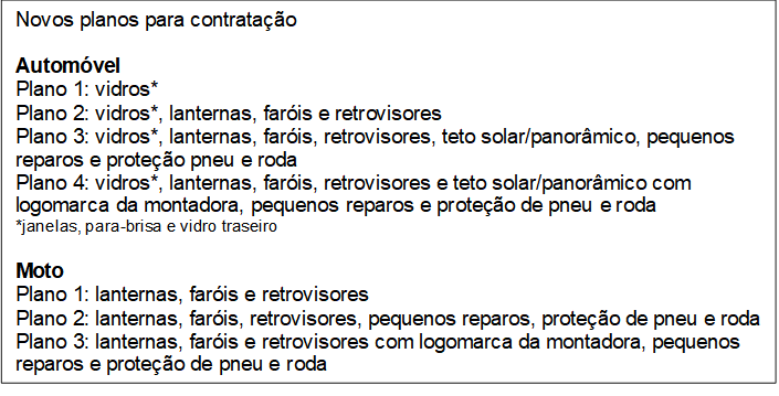 Com a opção básica (Plano 1), que cobre vidros de janelas, para-brisa e vidro traseiro no seguro Auto, e lanternas, faróis e retrovisores em Moto, os produtos passam a ter quatro e três planos, respectivamente. A depender da opção escolhida, a Allianz disponibiliza planos de coberturas, por exemplo, para teto solar/panorâmico e vidros com logomarca da montadora. Com as mudanças, a contratação da cobertura de vidros passa a ser opcional nos produtos de Automóvel, inclusive para veículos blindados, Moto e Caminhão.