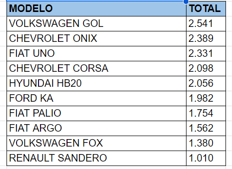 O VW Gol sofreu um aumento de 20% (de 2.111 ocorrências para 2.541), GM Onix se manteve na mesma média (de 2.393 para 2389), Fiat Uno aumento de 23% (de 1.891 para 2.331), GM Corsa aumento de 37% (de 1.534 para 2.098), Hyundai HB20 aumento de 28% (de 1.602 para 2.056), Ford Ka aumento de 18% (de 1.684 para 1.982), Fiat Palio aumento de 28% (de 1.366 para 1.754), Fiat Argo aumento de 91% (de 819 para 1.562), VW Fox queda de 11% (de 1.380 para 1.225) e Renault Sandero aumento de 75% (de 577 para 1.010).