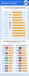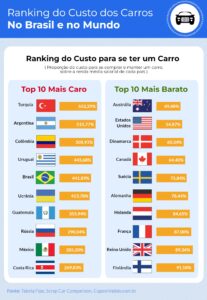 O resultado é que o Brasil ficou na 5ª colocação, como um dos países mais caros do mundo. Os brasileiros precisam gastar 441,89% do rendimento médio anual para se comprar e manter um carro zero.