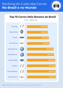 Veja abaixo o ranking dos top 10 carros mais baratos do Brasil com os preços já atualizados em 2022.