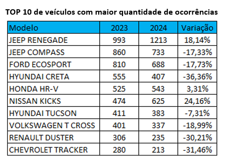 O Jeep Renegade segue como o SUV mais visado, representando 14,60% de todas as ocorrências do segmento. O modelo é um dos principais alvos de furtos, que representam 84,34% das ocorrências. Os bairros de Tatuapé, Perdizes e Vila Matilde são os pontos mais críticos para crimes envolvendo o Renegade.
