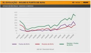 Nos quatro primeiros meses de 2022, o Estado de São Paulo viveu uma explosão de roubos e furtos de SUVs, segundo análise do Boletim Econômico Tracker-Fecap, com base no banco de dados da Secretaria de Segurança Pública. Entre janeiro e abril, foram registrados 714 furtos, o que representa um aumento de 213,16%, na comparação com o mesmo período do ano passado. Os roubos atingiram a marca de 542 ocorrências, 77,12% a mais do que nos quatro primeiros meses de 2021.