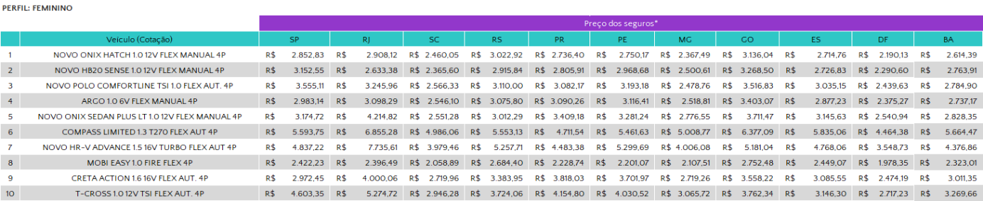 A maior variação para o perfil masculino ocorre no Rio de Janeiro, onde o modelo atingiu R$ 7.909,12 (+158,3%), enquanto uma das maiores variações para o perfil feminino se dá em Curitiba, chegando a R$ 2.228,74 (+15,4%).