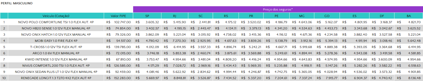 As cotações mencionadas no texto são as de menor valor dentro dos perfis cotados com as seguradoras.