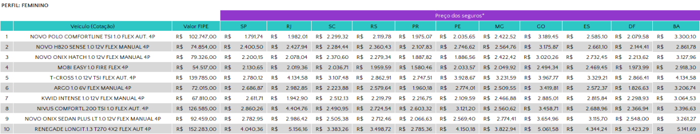 - O Novo Polo Comfortline se mantém em primeiro na lista dos mais vendidos, registrando a maior queda em ambos os perfis. No masculino, o modelo atinge o valor médio do seguro de R$ 4.176,56 (-7%). Já no feminino, o preço médio é de R$ 2.343,67 (-17,3%).