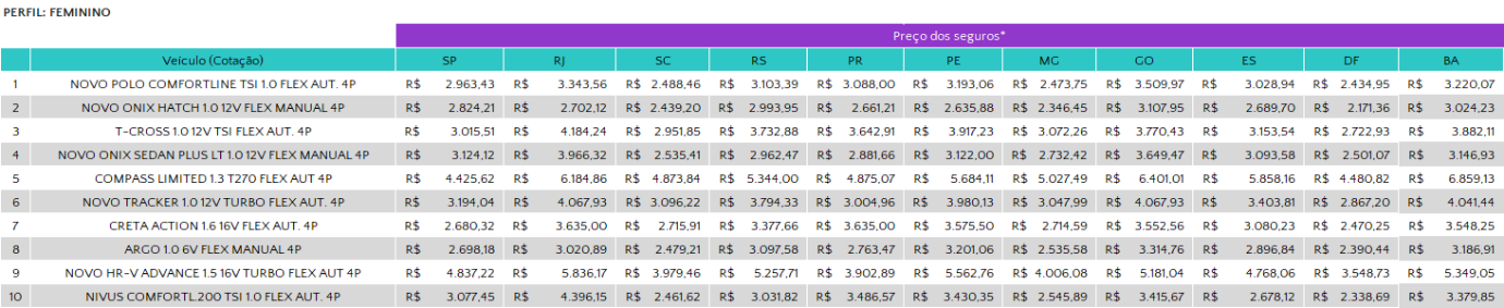 A maior variação para o perfil masculino ocorre em Salvador, onde o modelo alcançou R$ 6.236,98 (+35,2%), enquanto uma das maiores variações para o perfil feminino se dá em São Paulo, chegando a R$ 2.963,43 (-16,6%).