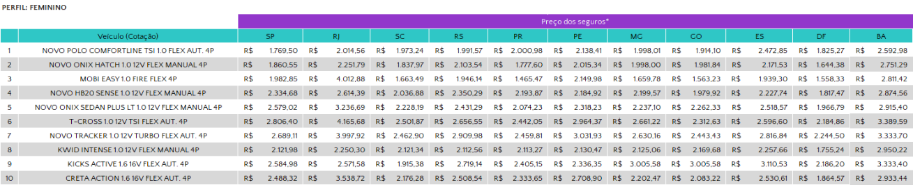 - O Novo Polo Comfortline se mantém em primeiro na lista dos mais vendidos e registra uma baixa em ambos os perfis, sendo a queda do feminino a maior do mês para o perfil. No masculino, o modelo atinge o valor médio do seguro de R$ 3.285,70 (-8,3%). Já no feminino, o preço médio é de R$ 2.062,86 (-8,7%).