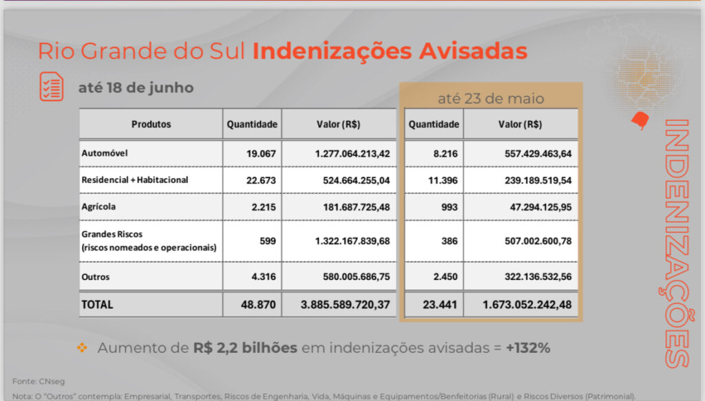 Já soma R$ 3,9 bilhões o valor de indenizações solicitadas em decorrência das fortes chuvas no Rio Grande do Sul. O montante se refere a 48.870 pedidos de indenizações, segundo dados coletados pela Confederação Nacional das Seguradoras (CNseg) até 18 de junho.
