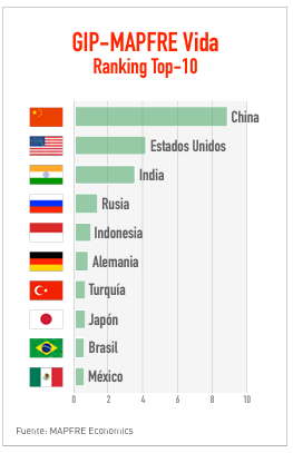 Os primeiros cinco países (China, Estados Unidos, Índia, Rússia e Indonésia) pertencem aos mercados de seguros de Vida considerados Tier-1. Eles são seguidos por Alemanha, Turquia, Japão, Brasil e México, que lideram a parte superior do Tier-2. Os quatro primeiros deste ranking mantêm suas posições relativas em relação ao ano anterior, enquanto o Japão foi superado pela Indonésia. Por outro lado, a Alemanha subiu uma posição e a Turquia subiu três posições, sendo a sétima economia com maior potencial segurador no ramo Vida. Em relação ao ano anterior, observa-se um crescimento generalizado do potencial segurador, destacando-se os mercados da Rússia e da Turquia.