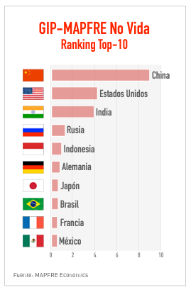 Levando em conta seu potencial segurador medido por meio do GIP-MAPFRE, as cinco primeiras posições do ranking do segmento Não Vida são para a China, Estados Unidos, Índia, Rússia e Indonésia (Tier-1). A mudança mais importante dentro do Tier-1 é a entrada da Rússia, que se posiciona em quarto lugar, desbancando o Japão, que ocupou essa posição em 2021 e está em sétimo lugar este ano. Correspondente ao grupo Tier-2, a Alemanha também ocupa a sexta posição acima do Japão, seguida do Brasil, França e México, destacando-se a ascensão da França para a nona posição, enquanto o Reino Unido caiu três posições em relação à estimativa do ano anterior, agora em 12º lugar. Em relação a 2021, observa-se um crescimento do potencial generalizado do segmento Não-Vida, com destaque para os mercados do México, Brasil e Arábia Saudita.