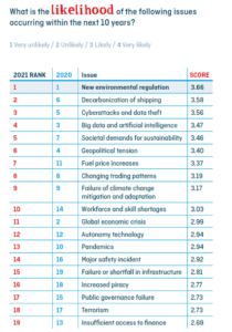 Segundo relatório Global Maritime Issues Monitor, a falha na mitigação e adaptação às mudanças climáticas e ataques de hackers, estão entre as principais preocupações dos executivos do setor marítimo