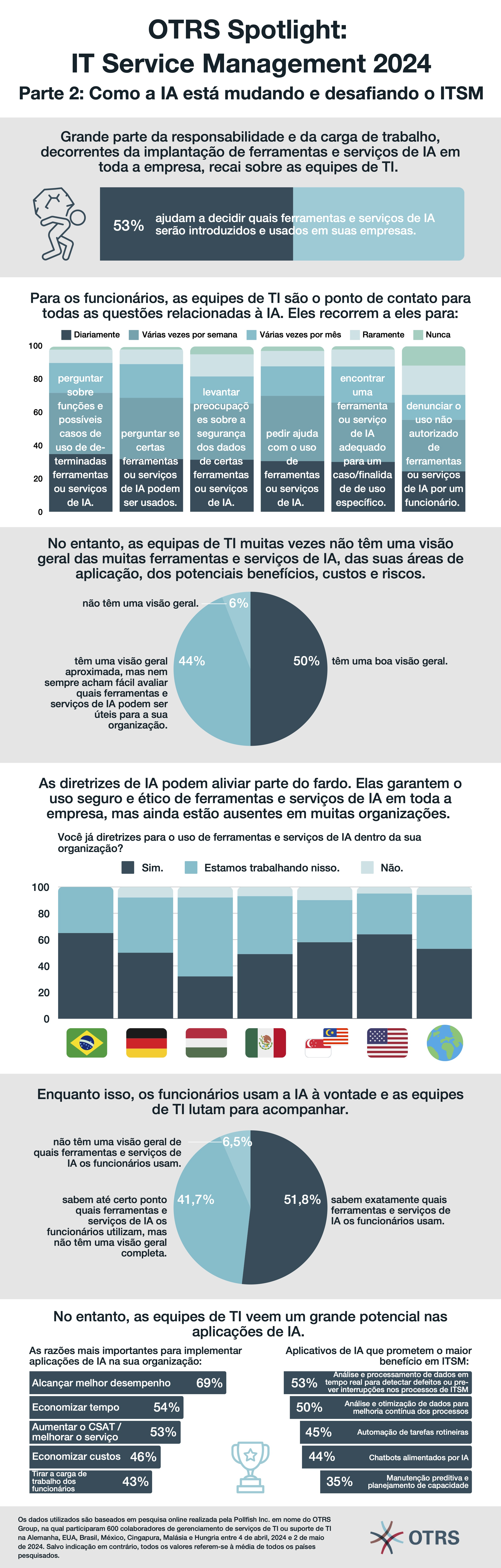 Os dados utilizados são baseados em pesquisa on-line realizada pela Pollfish Inc. em nome do OTRS Group, na qual participaram 600 profissionais de gerenciamento de serviços de TI ou suporte de TI na Alemanha, EUA, Brasil, México, Cingapura, Malásia e Hungria, entre 4 de abril e 2 de maio de 2024.