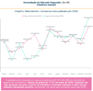 Em linhas gerais, em 2020, o seguro de veículos caiu 2,1%, em relação ao ano anterior, queda acentuada no primeiro semestre, mas com uma grande melhora no segundo.