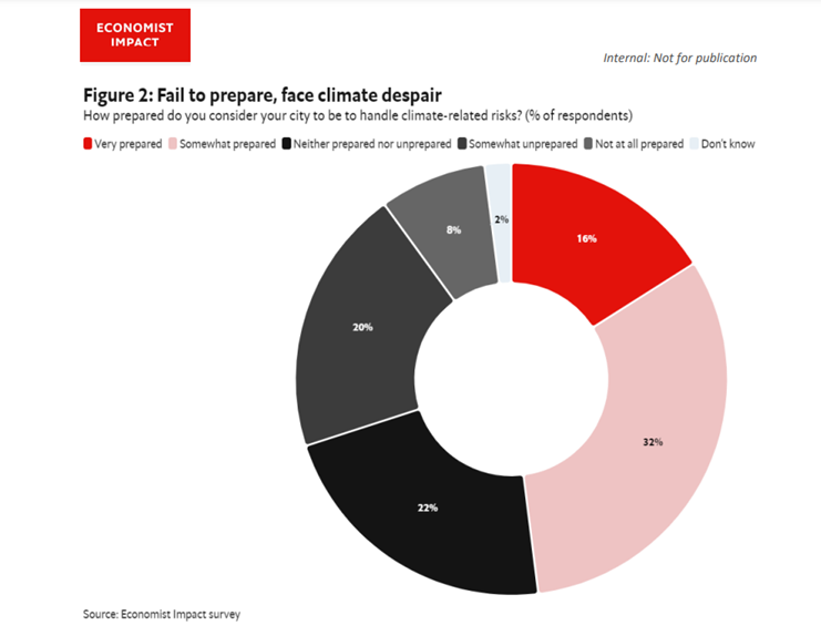 De acordo com o estudo, 32% dos entrevistados acham que sua cidade está “um pouco preparada” e mais de um quarto (28%) considera que sua cidade está despreparada para enfrentar as frequentes ondas de calor, inundações, escassez de água e poluição do ar que devem se tornar mais frequentes daqui para frente.