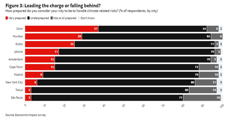 Quatro em cada cinco pessoas das 10 maiores metrópoles do mundo acreditam que as cidades em que vivem, em alguma medida, não estão organizadas para gerenciar os riscos climáticos e seus impactos. É o que mostra o estudo Resilience from the ground up: assessing city-level approaches to climate risk and adaptation, produzido pelo Grupo Zurich, em parceria com a Economist Impact, empresa internacional de pesquisa da Economist Group, parceira de empresas, governos e ONGs na produção de relatórios e estudos de impactos sociais.