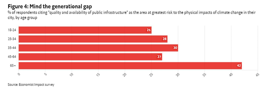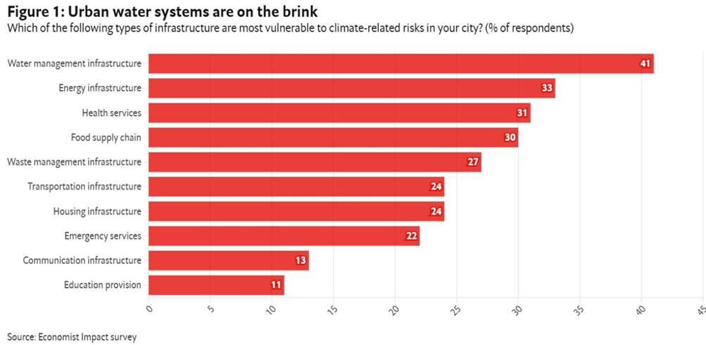 Segundo o levantamento, 41% dos indivíduos acreditam que os sistemas de gestão hídrica de suas cidades correm risco, indicando que problemas como secas, inundações e poluição da água são grandes preocupações nas cidades. Outros 33% estão preocupados com a infraestrutura energética. Sistemas de saúde são a preocupação de 31% dos entrevistados em caso de eventos climáticos extremos. Abastecimento de alimentos é apontado por 30% como ponto de vulnerabilidade, seguido por gestão de lixo e resíduos (27%), infraestrutura de transportes (24%), edificações (24%), serviços de emergência (22%), infraestrutura de comunicações (13%) e educação, mencionada por 11% dos entrevistados.