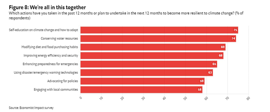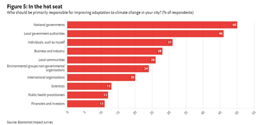 Quando se avalia a responsabilidade individual, um terço dos entrevistados se sente pessoalmente responsável pela adaptação climática em sua cidade e já tomou alguma medida nos últimos 12 meses, ou planeja fazê-las nos próximos 12 meses para se tornar mais resiliente às mudanças climáticas. 58% estão tomando ou planejam tomar medidas para se adaptar às mudanças climáticas.