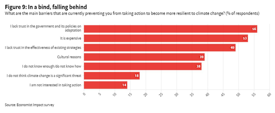 Uma parcela dos entrevistados citou alguns obstáculos que a impede de tomar mais medidas de adaptação climática.56% dizem não confiar nas diretrizes dos governos para a adaptação climática. O custo é a principal barreira para 53%, e 49% não confiam na eficácia das estratégias existentes. Barreiras culturais são apontadas por 39%.