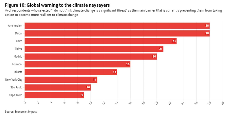 O desconhecimento das ameaças climáticas também foi avaliado pelo estudo. Em Amsterdam (28%) dizem não ter certeza de que mudanças climáticas são uma grande ameaça. No Cairo o índice é de 23%, Tóquio e Madri (21% e 20%, respectivamente). Em São Paulo, apenas 10% duvidam da ameaça do clima.
