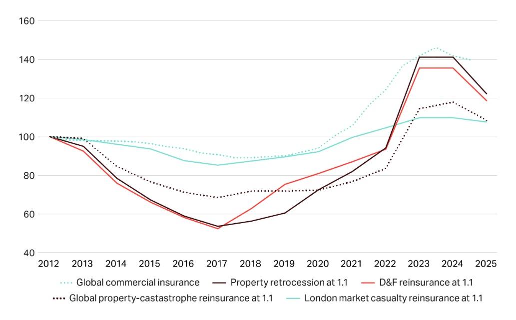 A dinâmica favorável da oferta tornou-se cada vez mais evidente nos mercados de seguros e resseguros nos últimos 12 meses. Essa dinâmica desempenhou um papel fundamental nas renovações de resseguro de 1º de janeiro de 2025, promovendo a concorrência, que levou a reduções de taxas ajustadas ao risco em várias áreas (veja a Figura 1).