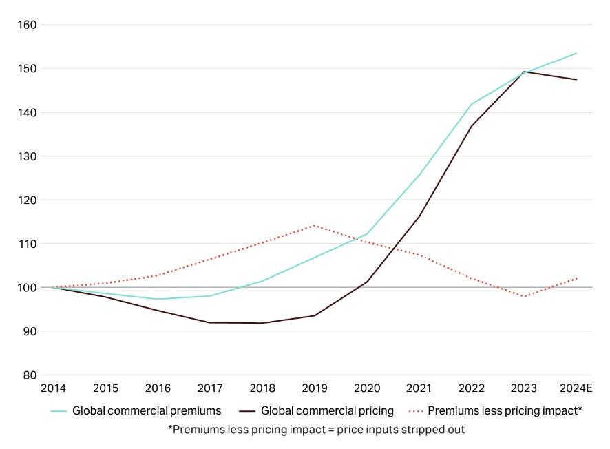 Figura 2: Índice de prêmios globais em relação aos preços globais do seguro comercial – 2014 a 2024 (Fonte: Howden)