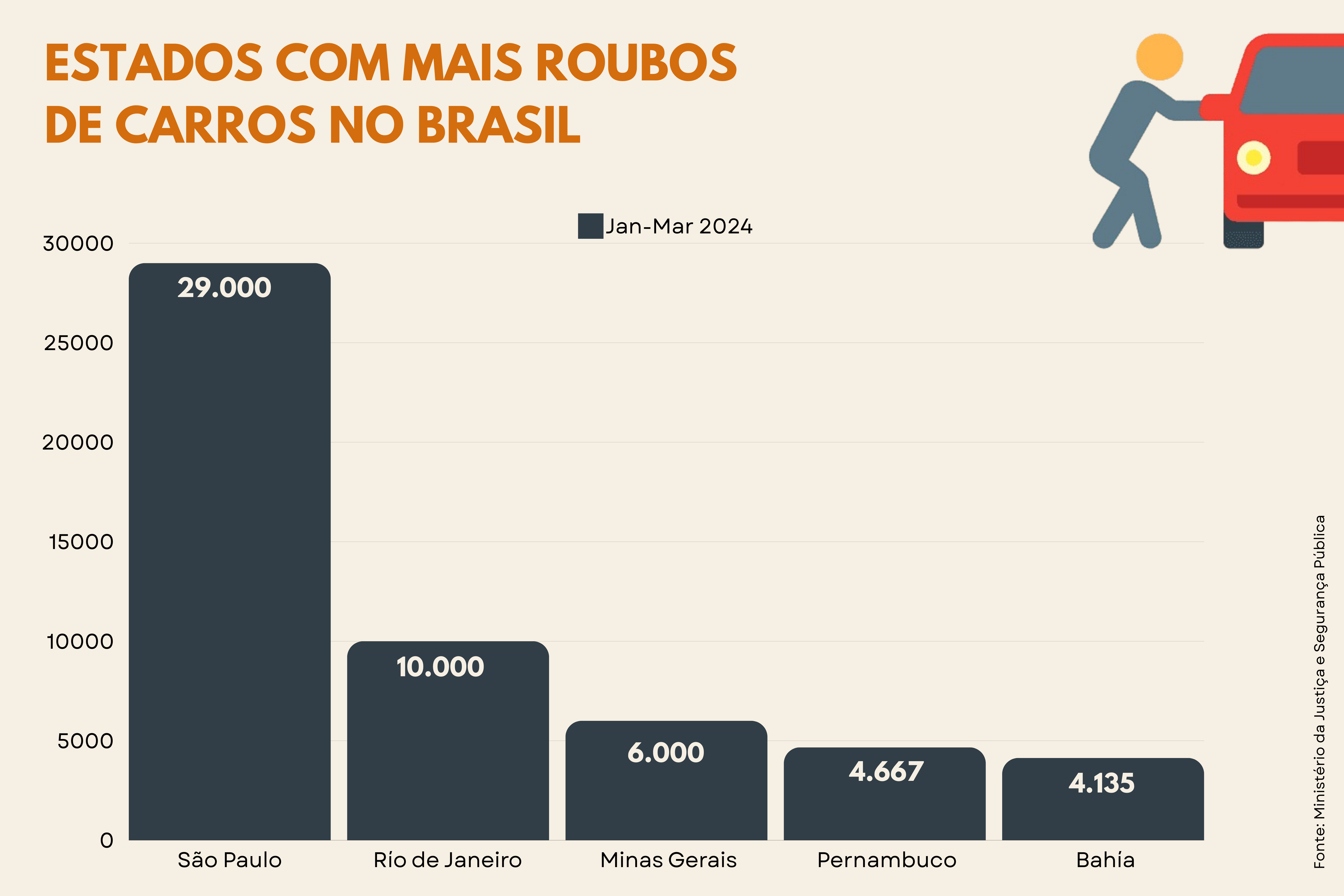 De fato, São Paulo lidera a lista dos estados brasileiros com o maior número de roubos de veículos, acumulando 29.000 casos entre janeiro e março deste ano, de acordo com dados do Plano Nacional de Segurança Pública e Defesa Social do Ministério da Justiça. Em seguida, vem o Rio de Janeiro, com 10.000 registros, enquanto Minas Gerais está em terceiro lugar, com 6.000 ocorrências. Em quarto lugar está Pernambuco, com 4.667 casos, seguido pela Bahia, que registrou 4.135 roubos no mesmo período, o que equivale a uma
