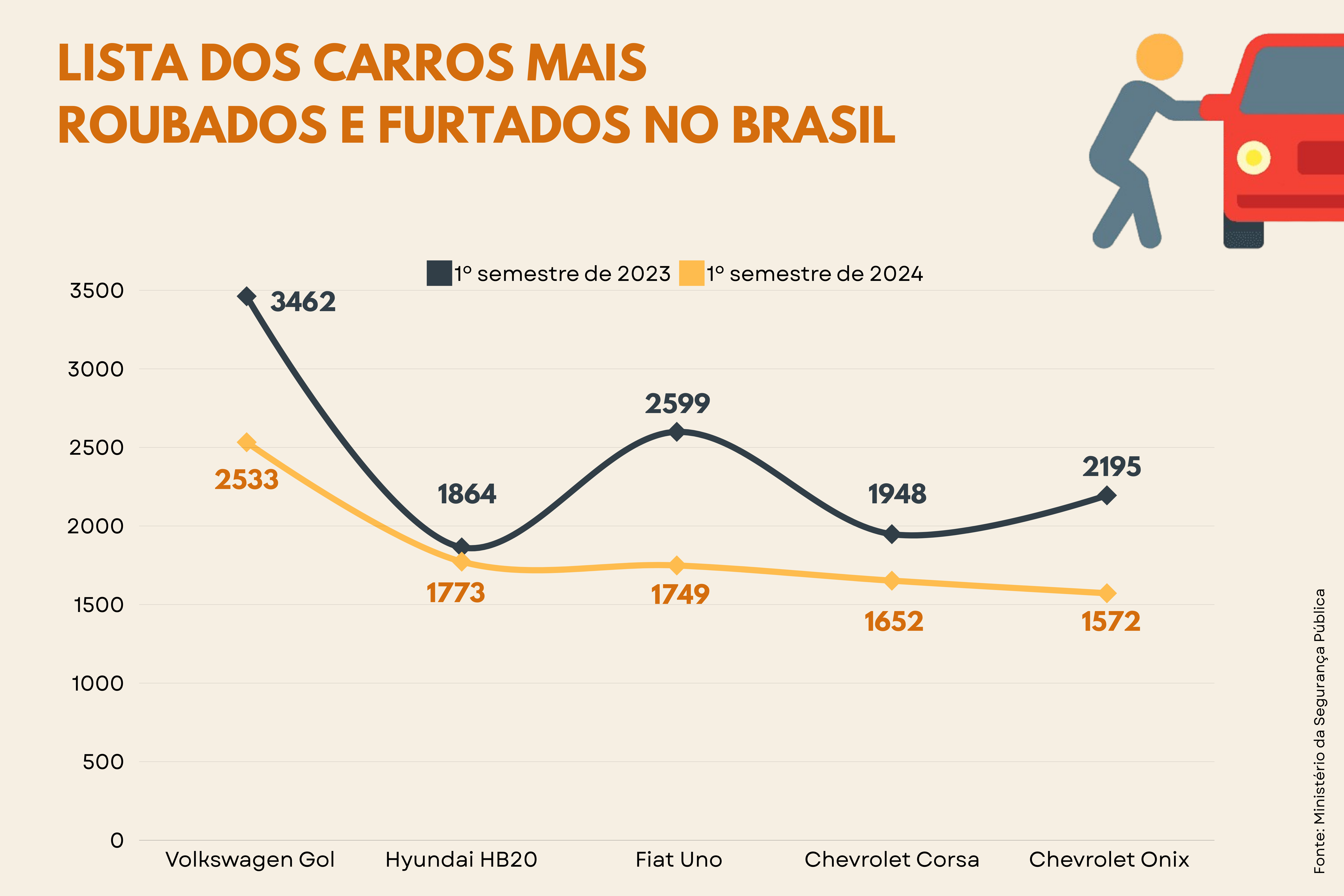 No primeiro semestre do ano, o Volkswagen Gol manteve sua posição como o modelo mais roubado, seguido pelo Hyundai HB20 e pelo Fiat Uno.