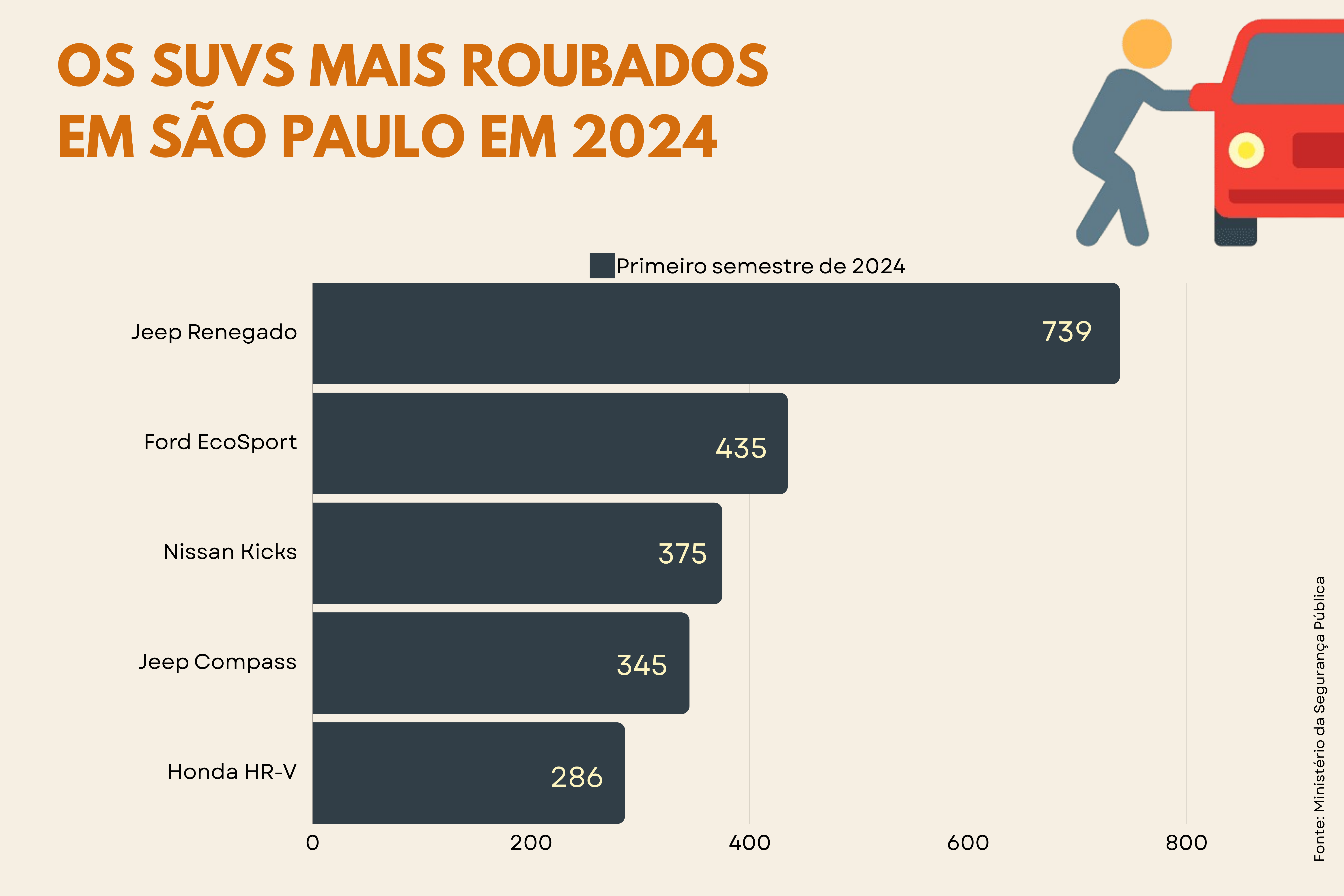 Os utilitários esportivos também não estão isentos desse problema. No primeiro semestre de 2024, quase 5.000 roubos e furtos de veículos utilitários esportivos foram registrados no estado. Modelos como o Jeep Renegade, co 739 incidentes, e o Ford EcoSport, com 435, lideraram o ranking. Esses crimes se concentraram em áreas específicas da capital, como Tatuapé e Água Rasa, refletindo uma tendência que aponta os veículos de maior valor como alvos dos criminosos.
