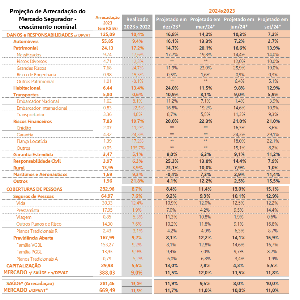 A Confederação Nacional das Seguradoras (CNseg) estima que a arrecadação do setor será 11% maior em 2024, um ponto percentual acima da revisão das projeções apresentadas na Conjuntura nº 105, de junho deste ano, mas 0,7 ponto percentual abaixo da previsão divulgada em dezembro de 2023.