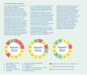Um dos destaques do documento é o Scorecard de Mudanças Climáticas da Zurich que, por meio de 12 métricas climáticas, aponta como estamos evoluindo para reduzir o aquecimento global a menos de 2° C – o que evitaria que o mundo chegasse num ponto sem retorno no qual não haverá mais como evitar uma situação catastrófica. Este Scorecard dá um panorama da evolução das dimensões que impactam diretamente o clima desde 2019 (ver imagem abaixo).
