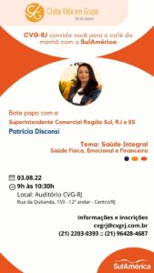 Nesse quarto Café da Manhã do CVG-RJ com uma seguradora parceira, a SulAmérica é a convidada especial. Patrícia Disconsi, superintendente comercial Região Sul, Rio de Janeiro e Espírito Santo da SulAmérica, irá abordar o tema “Saúde Integral” e sua importância para a saúde física, emocional e financeira.