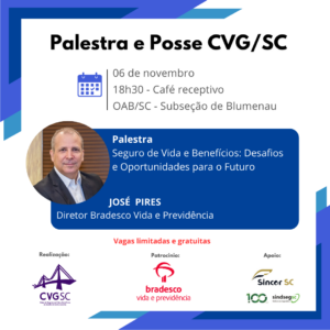 Para celebrar a posse da nova gestão, o CVG/SC promoverá uma palestra especial com José Pires, Diretor da Bradesco Vida e Previdência. O evento acontecerá no dia 6 de novembro, às 18h30, na OAB/SC – Subseção de Blumenau, localizada na Rua dos Advogados, nº 180, no bairro Escola Agrícola.