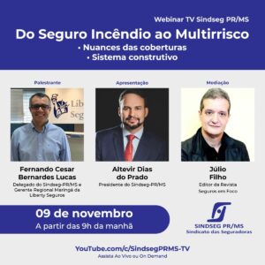 A partir das 9h da próxima terça-feira, 09 de novembro, a TV do Sindicato das Seguradoras do Paraná e de Mato Grosso do Sul (Sindseg PR/MS) promove o webinar: “Do Seguro Incêndio ao Multirrisco”.