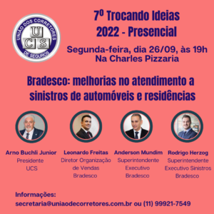 Os serviços de assistência nos seguros automóvel e residencial, e o atendimento nas oficinas para reparos automotivos, estão sendo ajustados pelas seguradoras – a falta de peças e de prestadores de serviços estão entre as principais dificuldades enfrentadas pelas companhias. Para apresentar soluções desenvolvidas nessas áreas, a União dos Corretores de Seguros (UCS) recebe o diretor da Organização de Vendas da Bradesco Seguros, Leonardo Freitas, o diretor Executivo, Anderson Mundim, e o superintendente Executivo de Sinistros da companhia, Rodrigo Herzog, em mais uma edição presencial de seu tradicional evento Trocando Ideias, aberto a todo o mercado de seguros, incluindo corretores associados ou não, seguradores, imprensa, e demais prestadores de serviços.