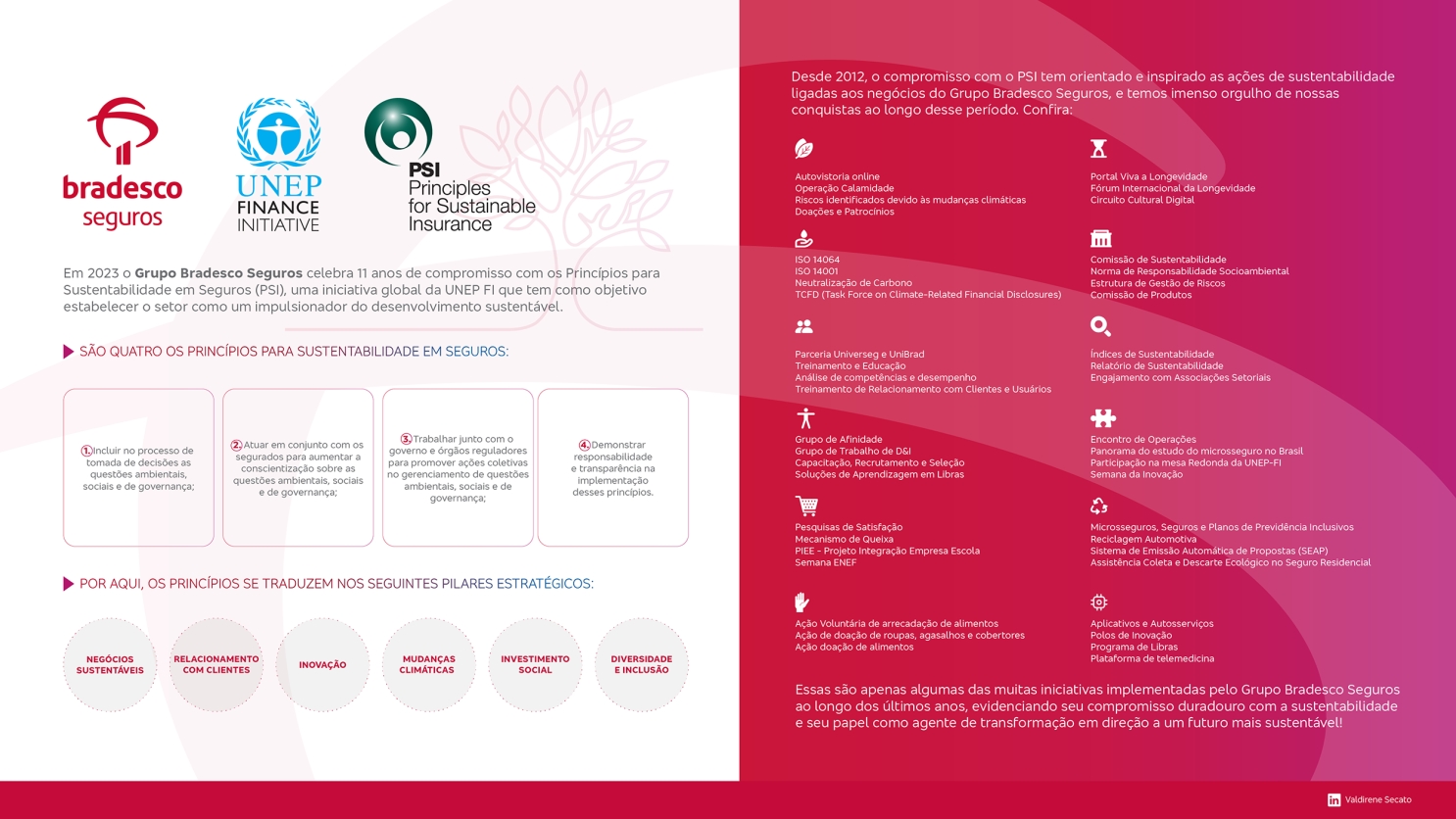 No mês de junho, completa-se 11 anos desde que os ‘Princípios para a Sustentabilidade em Seguros’ (PSI) foram desenvolvidos pela Organização das Nações Unidas (ONU). Ainda neste ano, a Grupo Bradesco Seguros também completará 11 anos de adesão a esse compromisso. A iniciativa global faz parte do Programa das Nações Unidas para o Meio Ambiente – iniciativa financeira (UNEP-FI), cujo objetivo é engajar a indústria de seguros a promover ações ASG (Ambientais, Sociais e de Governança) em seus negócios, visando o desenvolvimento sustentável.