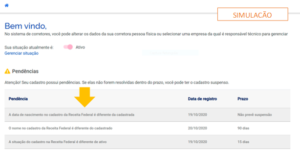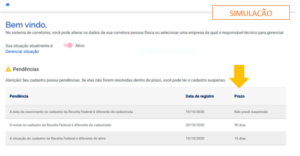 Em caso de identificação de pendência/inconsistência (Ex: nome informado diferente dos dados na Receita Federal, etc), o corretor é alertado por meio do endereço eletrônico cadastrado no Sistema de Registro. Na mensagem encaminhada consta a situação identificado e o prazo para correção.