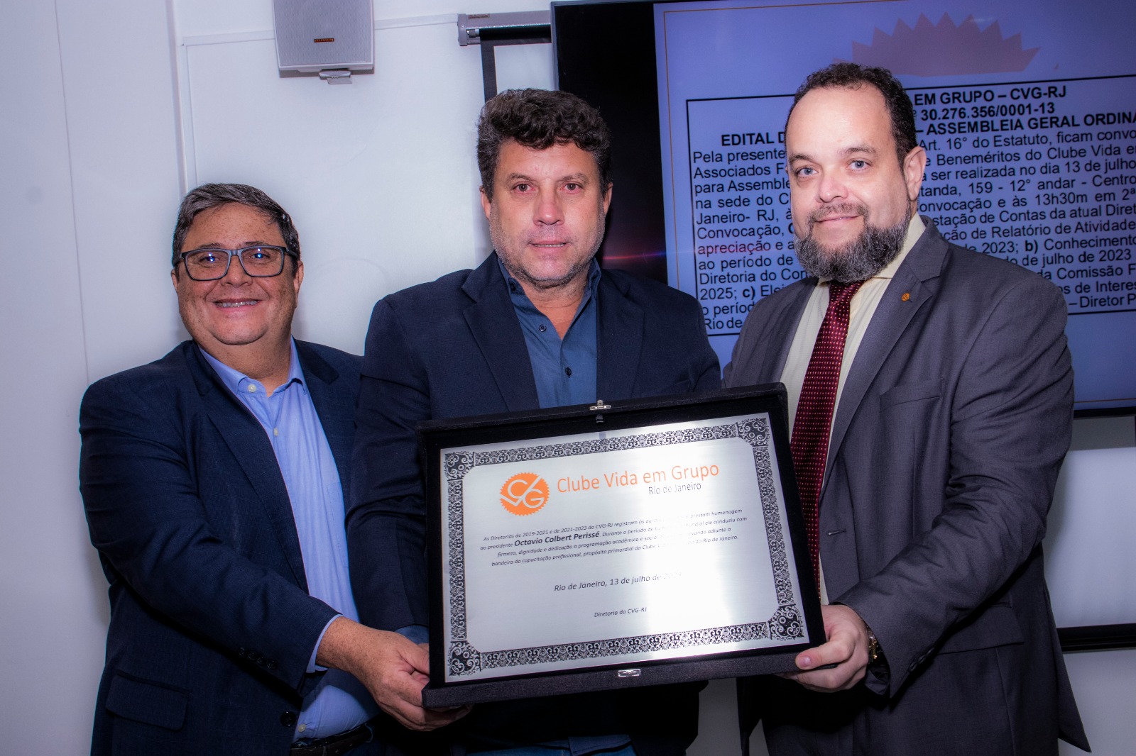Octávio Perissé (C) recebe homenagem, ao lado de Edson Calheiros (E) e Vinicius Brandão (D)