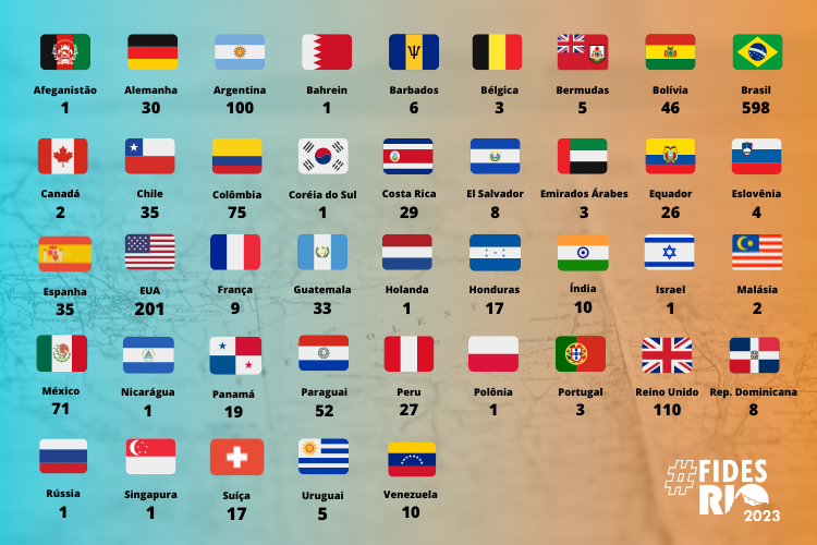 De 24 a 26 de setembro deste ano, acontece a FIDES Rio 2023, maior conferência de seguros da América Latina. O evento, promovido pela Confederação Nacional das Seguradoras (CNseg), já vendeu os 1,5 mil ingressos, representando 100% das vagas disponíveis. De acordo com a organização, ao todo, o encontro reunirá profissionais do setor de 41 países. Confira a lista completa: