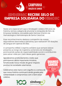 Nesta semana o SindsegSC – Sindicato das Empresas de Seguros Privados, de Resseguros e de Capitalização no Estado de Santa Catarina foi surpreendido por mais um reconhecimento pelas suas ações sociais: o recebimento do selo de Empresa Solidária, concedido pelo Hemosc.