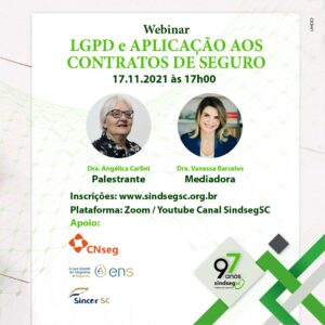 Em comemoração aos 97 anos da entidade, o Sindicato das Seguradoras de Santa Catarina – SindsegSC, com o apoio da CNseg – Confederação Nacional das Seguradoras, da ENS – Escola de Negócios e Seguros, e do SincorSC – Sindicato dos Corretores de Santa Catarina, promoverá no dia 17 de novembro, às 17 horas, o webinar “LGPD e Aplicação aos Contratos de Seguro”.