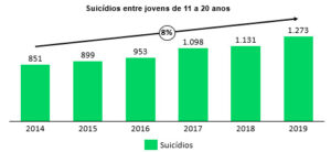 O número de suicídios no Brasil cresceu 28% em cinco anos. Entre 2014 e 2019, as pessoas que tiraram a própria vida passaram de 9,7 mil para 12,4 mil. Boa parte deste aumento tem sido registrado entre jovens de 11 a 20 anos, no qual este tipo morte aumentou neste período 49,6%.