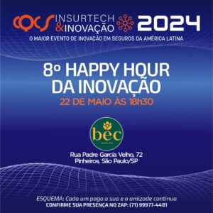 A oitava edição do Happy Hour da Inovação já tem data marcada. No próximo dia 22/05, às 18h30, no BEC Bar em São Paulo.  A iniciativa reunirá importantes lideranças do ecossistema de Seguros, com o objetivo de trocar conhecimento, discutir tendências do mercado e ampliar o networking.