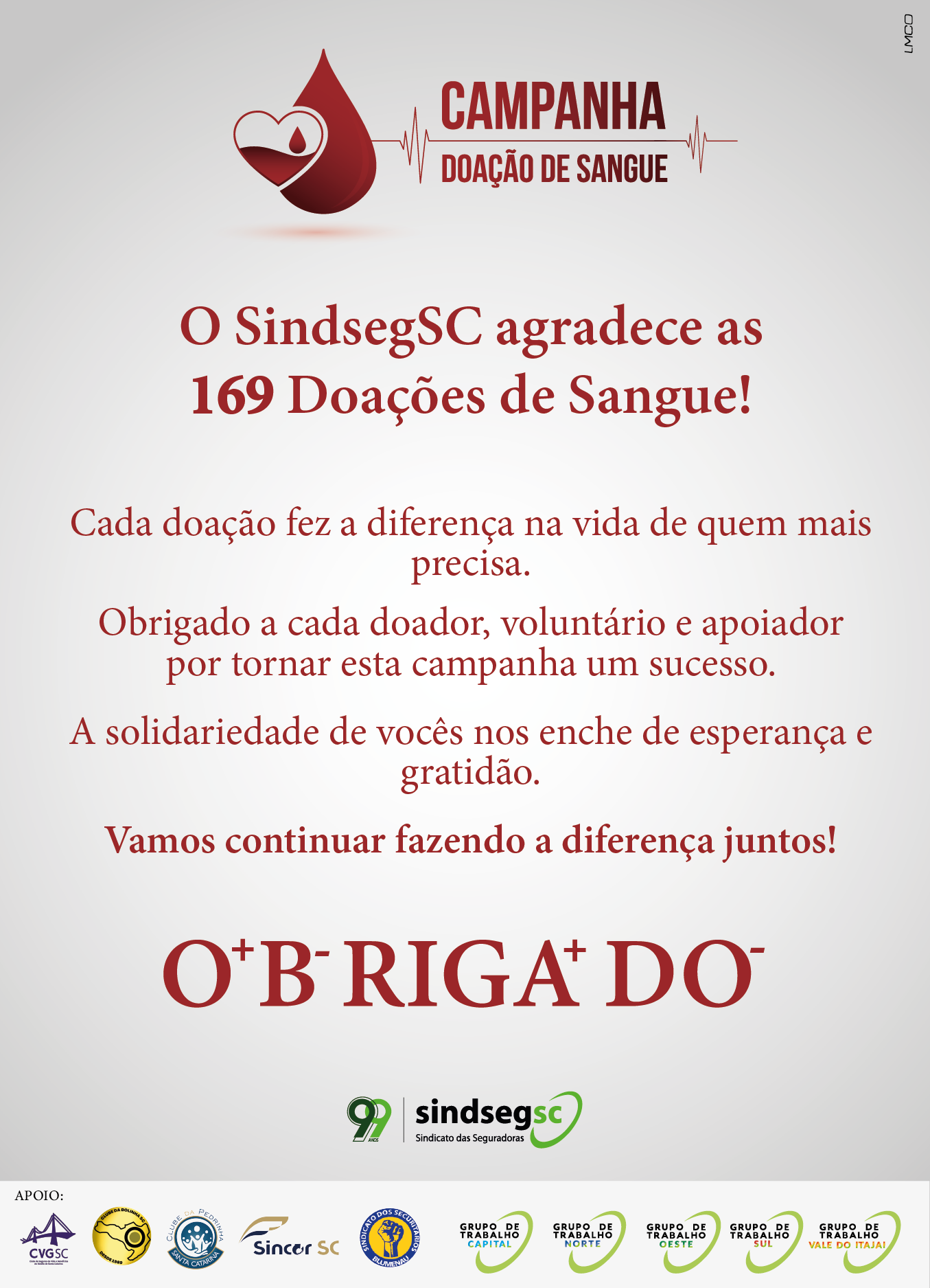 A 4ª edição da campanha Doação de Sangue do SindsegSC intitulada “Você doa o sangue, nós o alimento” encerrou no dia 31 de outubro, terça-feira, com um número expressivo de doadores. Foram 169 heróis que doaram #amor #vida #sangue.