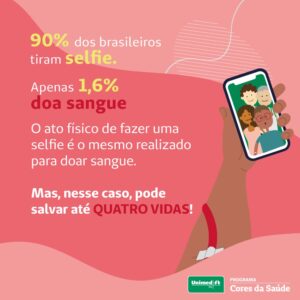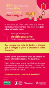 No mês em que é comemorado o Dia Mundial do Doador de Sangue (14/06), a Unimed-Rio deu início à campanha #selfiequesalva com o objetivo de incentivar a doação de sangue entre a população. A ação faz parte do projeto Cores da Saúde, que apoia, ao longo do ano, os principais movimentos e campanhas de conscientização para uma vida mais saudável. O Junho Vermelho incentiva o espírito de solidariedade quanto à doação de sangue, conscientizando a população sobre a importância do ato para salvar vidas.