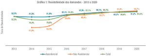O gráfico abaixo traz a séria histórica dos índices de resolutividade das demandas abertas pelos beneficiários, separadas por demandas assistenciais e não assistenciais.