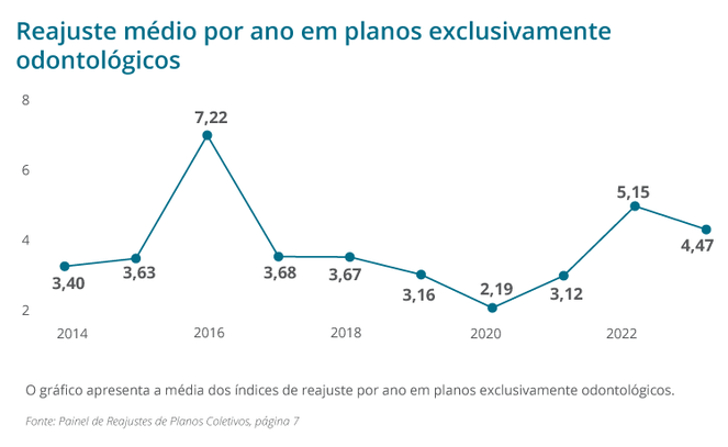 O reajuste médio aplicado aos planos com cobertura exclusivamente odontológica entre janeiro e novembro de 2023 foi 4,47% e está abaixo do reajuste médio observado nos doze meses de 2022.