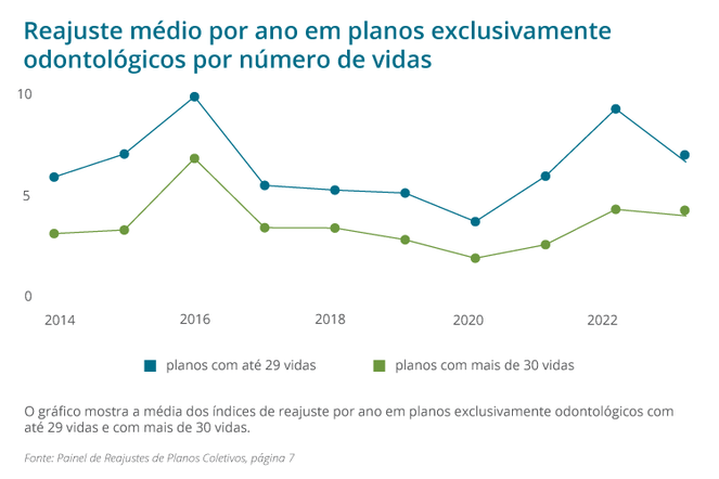 Por porte de contrato, o reajuste médio correspondeu a 6,64% nos contratos com menos de 30 vidas, superando o reajuste de contratos com 30 vidas ou mais em 2,6 pontos percentuais (4%). Os planos exclusivamente odontológicos não estão sujeitos à regra de agrupamento de contratos e representam 20% dos beneficiários em contratos coletivos que receberam reajustes entre janeiro e novembro de 2023. Neste segmento os contratos com até 5 vidas representavam 10% dos beneficiários.