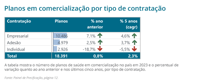 O crescimento anual do volume de planos nos últimos cinco anos foi impulsionado por planos coletivos empresariais e por adesão (4,6% e 3,7% respectivamente); por planos com fator moderador (planos com coparticipação ou franquia ou ambos), na ordem de 4,3%, e por planos que oferecem cobertura com abrangência municipal ou em um grupo de municípios (4,6% e 3,2%, respectivamente). A queda mais expressiva é verificada nos planos de contratação individual (-18,7% em 2023 e -5,5% por ano nos últimos cinco anos). Apesar da entrada no mercado de operadoras buscando, especificamente, o mercado individual, a ausência das seguradoras e de medicinas de grupo continua a impactar essa carteira.