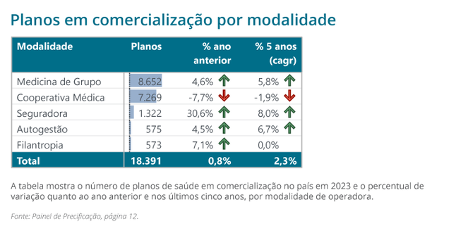 Quando se faz uma análise por modalidade da operadora, percebe-se que o volume de planos de seguradoras e autogestões tiveram o maior crescimento anual, de 8% e 6,7%, respectivamente, seguidos de medicinas de grupo, de 5,8%. Já os planos de filantropias se mantiveram estáveis, mas as cooperativas médicas tiveram queda de 1,9%.