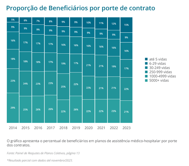 Contratos com menos de 30 vidas representaram 24% do total de beneficiários nos contratos coletivos que receberam reajustes entre janeiro e novembro de 2023, apresentando um aumento de 10 pontos percentuais em relação à participação de 14% nos doze meses de 2014. Dentre estes contratos de menor porte, os contratos com até cinco vidas ampliaram sua participação de 5% em 2014 para 15% na parcial de 2023.